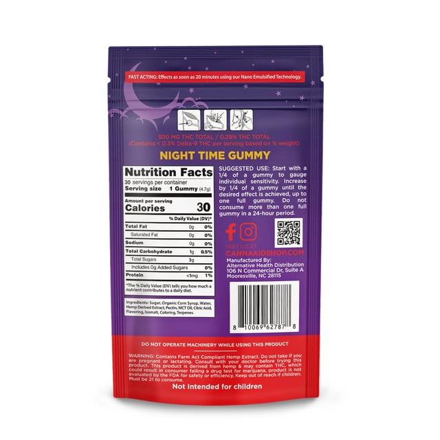 Get ready for some awesome sleep! These night time CannaAid Delta 9 THC + CBDs gummies are the perfect compliment to a good night’s rest (one that you may or may not hit the snooze button after). These gummies are packed with 10mg of Delta 9 + 10mg of CBD + 10mg of CBN in each gummy. The Nighttime flavors consist of a combination of Blue Razz, Blueberry, and Strawberry.
